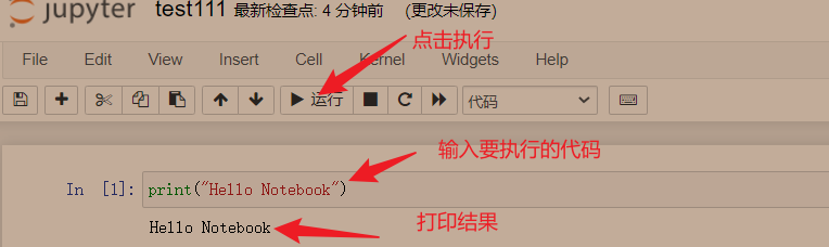 单元格可分为3种不同类型:Code、Markdown和Raw NBConvert,单元格为Code类型,这个单元格中可以输入一行或多行的Python代码,同时可以运行该代码。在Code单元格中输入了一行代码,然后单击工具栏中的“运行”按钮,Notebook中将打印输出: