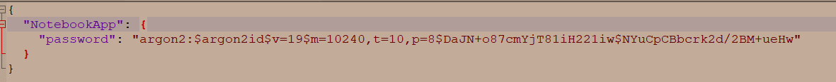 c.NotebookApp.password = 'argon2:$argon2id$v=19$m=10240,t=10,p=8$DaJN+o87cmYjT81iH221iw$NYuCpCBbcrk2d/2BM+ueHw'