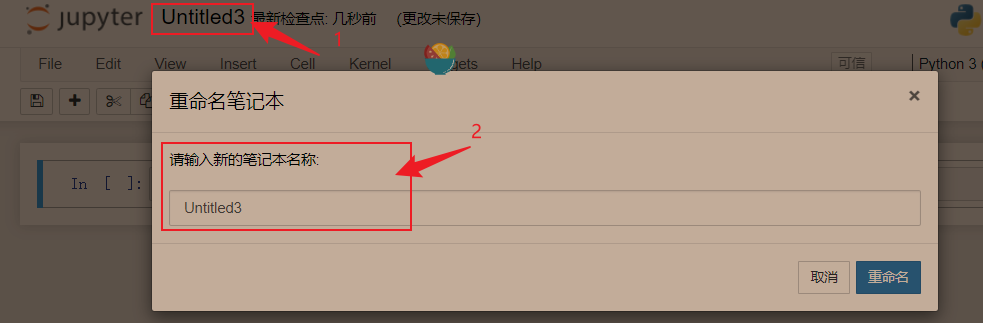 首先运行命令jupyter notebook,单击右侧菜单“New”,选择使用python 3环境创建新的Notebook,此时浏览器将在新的标签页中创建一个Notebook。该Notebook的文件名为Untitled,可以单击Notebook中的“Untitled”对文件名进行修改,如图所示。