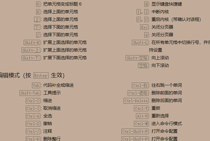 编辑模式下可以输入代码或文档,而命令模式下可以执行Jupyter Notebook命令。在编辑和命令模式之间切换,分别使用Esc键和Enter键。 快捷键命令可以通过在命令模式下按H键来获得帮助,即首先按Esc键,然后按H键