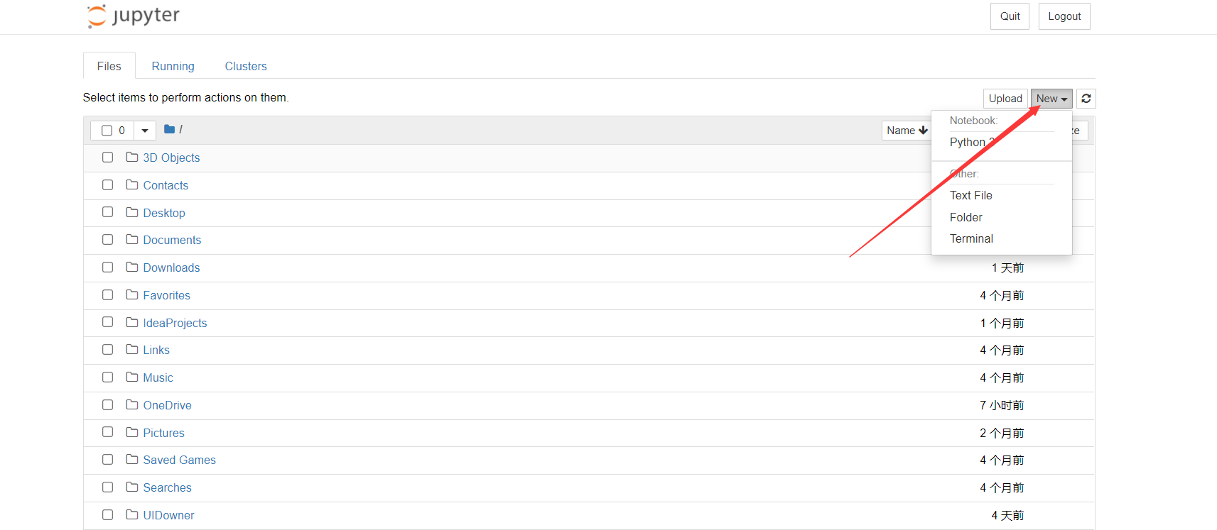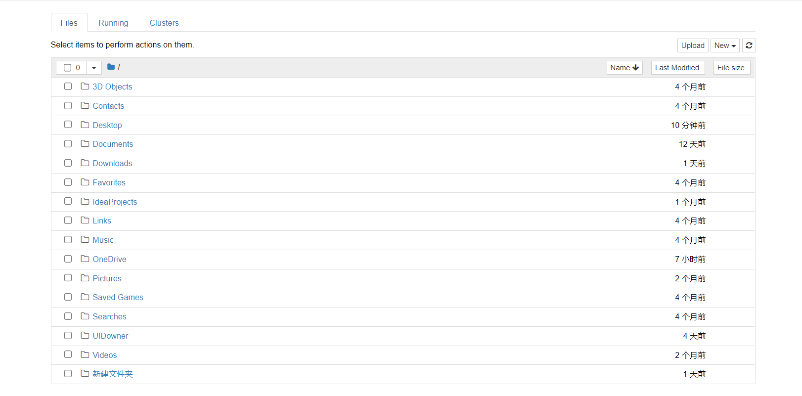 每一台不同的电脑打开之后的界面是不同的,仔细观察就会发现,这里面现实的一些文件夹就是电脑用户目录下面的文件夹,那是因为jupyter notebook在启动的时候总是有一个默认的目录,一般情况下,使用户的目录。