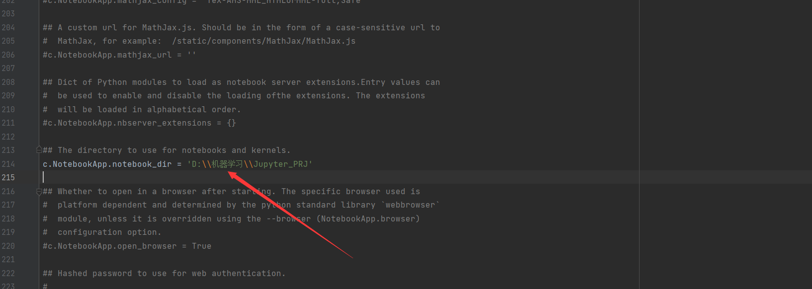 我的修改: c.NotebookApp.notebook_dir = 'D:\机器学习\Jupyter_PRJ'