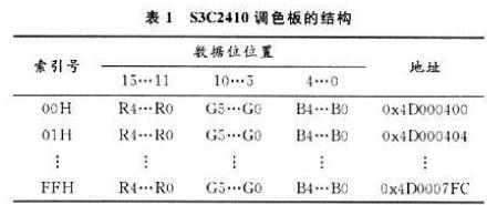 调色板中颜色的选择可以由用户任意定义,但为了编程方便,颜色的选取应遵循一定的规律。例如在Windows编程中,系统保留了20种颜色。另外,在Web编程中,也定义了216种Web安全色,这些颜色可以尽量保留。2S3C2410调色板在嵌入式Linux系统下的使用ARM实现图像显示时,由LCD控制器将存储系统中的视频缓冲内容以及各种控制信号传送到外部LCD驱动器,然后由LCD驱动器实现图像数据的显示。实际应用中,常通过驱动程序由操作系统对寄存器、调色板进行配置。以Linux 2.4内核为例,对调色板的配置是在驱动程序S3C2410fb.c中完成的。