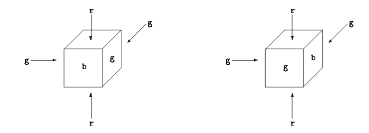 可表示为“rbgggr” 和 “rggbgr”, 第二个就是绕着Z轴顺时针旋转90度与第一个相同的骰子.