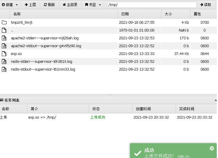 接着就是打redis,在phpinfo发现有open_basedir,有个tmp还能用,那就把恶意so传上去