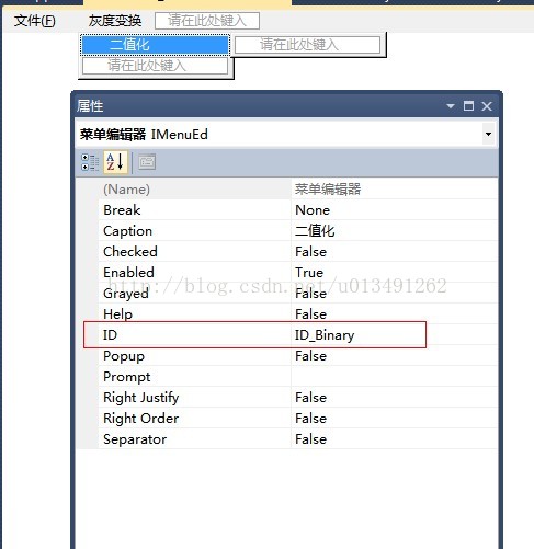 4.1 : Menu 中加入“二值化” , 并设置ID号(随意,自己认识就行)