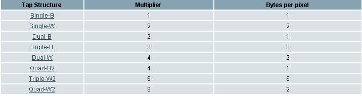 为了计算前端数据流的峰值数据流量,使用相机的像素时钟(Data Clock Speed)乘以Tap(数据传输通道)来表示,Tap 结构如下表所示: