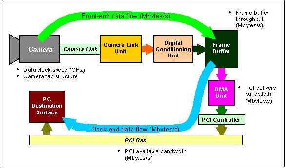 图1所示,Front-end data flow(前端数据流)指的是相机传送数据到图像采集卡内部帧缓冲存储的视频数据的速率。