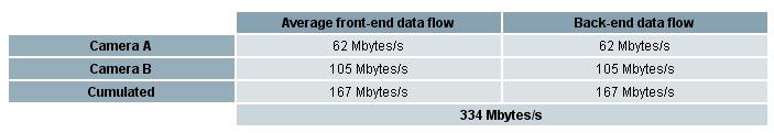 这个应用需要相机A的前端平均数据流速率为62 Mbytes/s,相机B的前端平均数据流速率为105 Mbytes/s。此应用需要获取和存储到PC内存中时不会出现延迟现象,因此需要每个通道的后端数据流等于平均前端数据流。