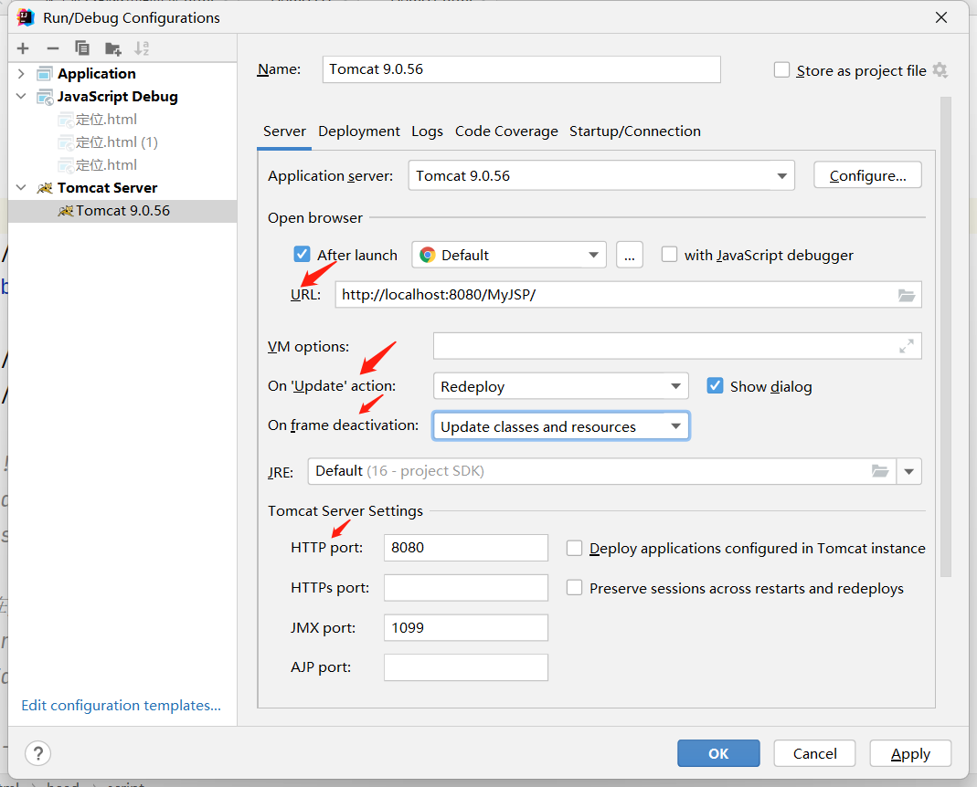 URL一栏表示当Tomcat服务器启动时,直接访问http://localhost:8080/MyJSP/这个网址,并且使用默认浏览器。