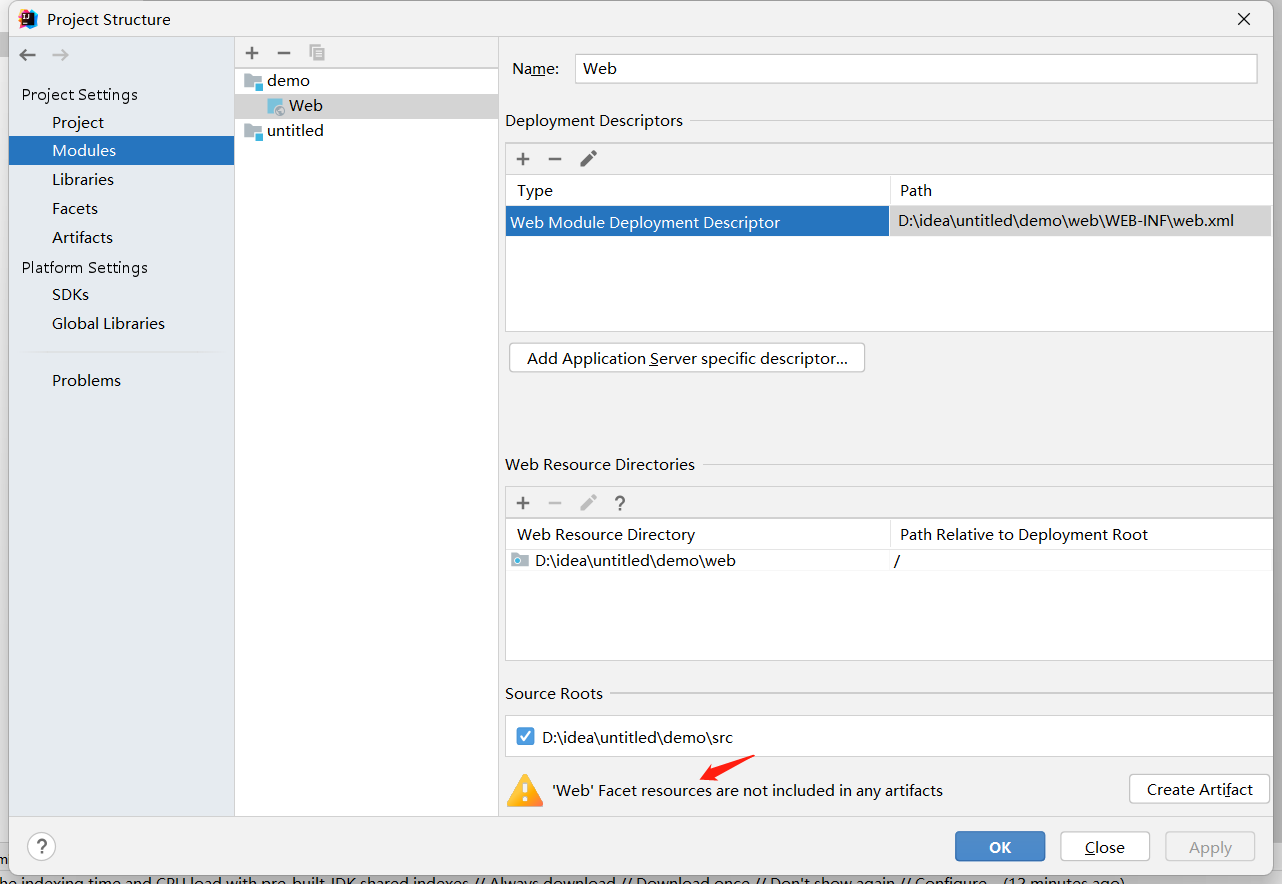 这个提示意思是,现在已经有了web项目,但这个web项目以后需要部署到Tomcat上去,但此时还没有部署包,现在是否需要创建一个部署包。所以点击Create Artifact创建部署包就OK了。