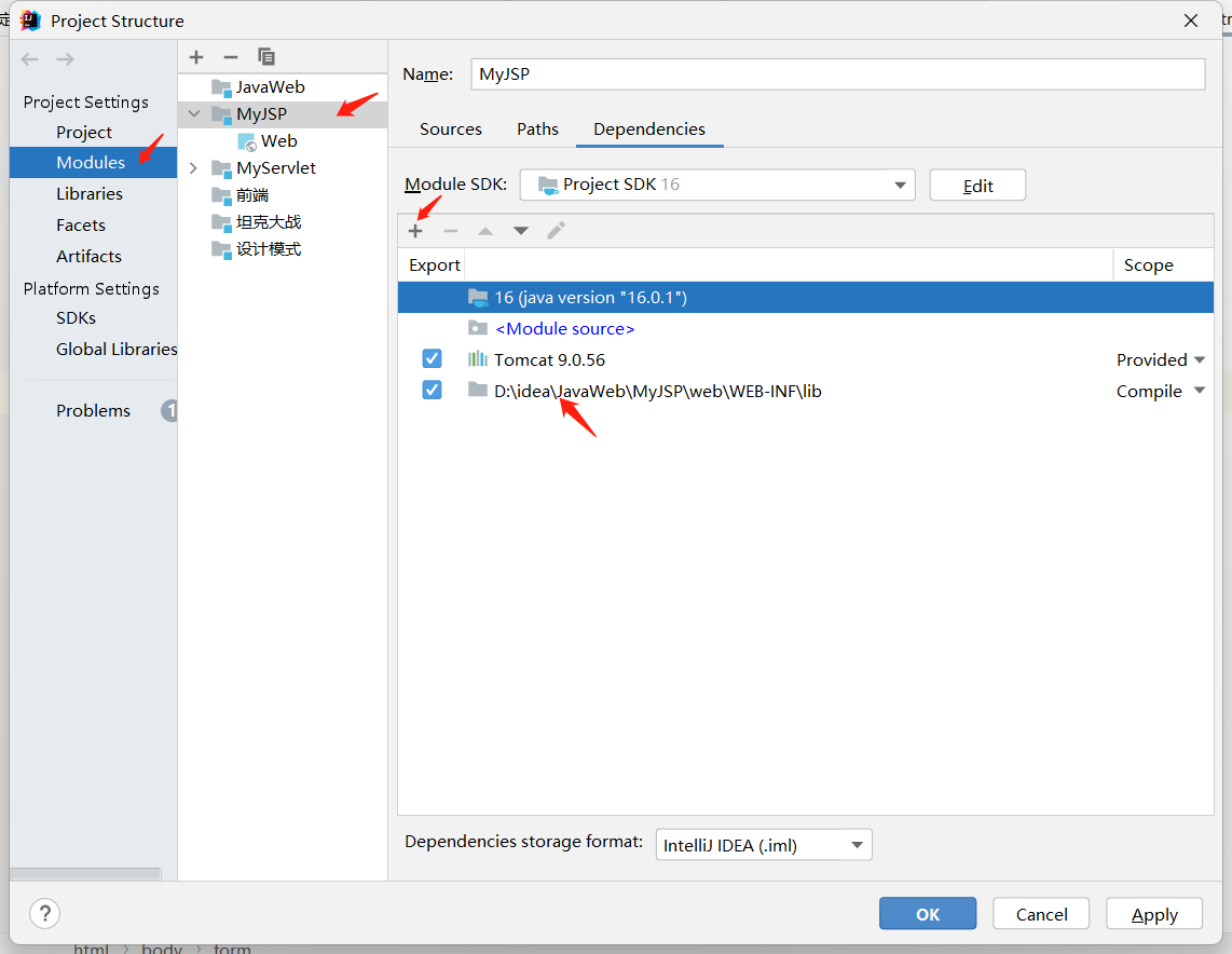 创建lib库时,可以创建到module中,但这时只能这个module独享,其他module不能用,所以可以创建到project下面,但要记得module中要添加依赖。但将lib放在module中的WEB-INF文件夹下的话,就不用将lib在添加到部署包了。