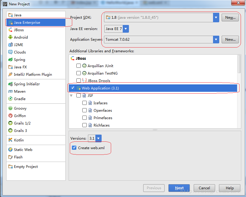点击Project后出现如下界面,选择Java Enterprise,选中下图圈中部分