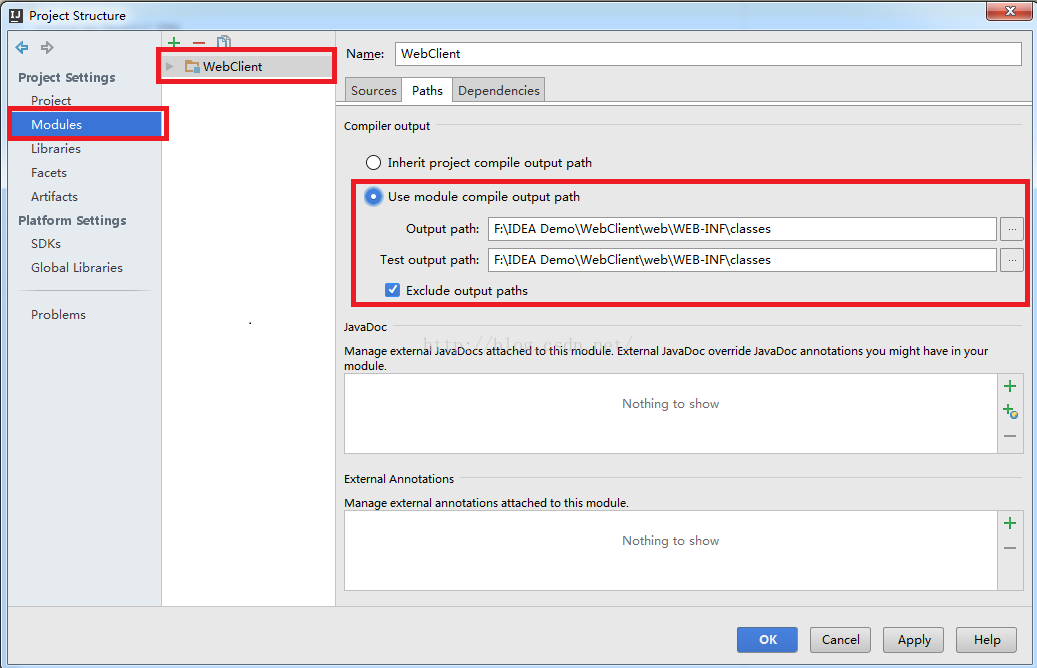 2.2 File --> Project Structure...,进入 Project Structure窗口,点击 Modules --> 选中项目“WebClient” --> 切换到 Paths 选项卡 --> 勾选 “Use module compile output path”,将 “Output path” 和 “Test output path” 都改为之前创建的classes目录
