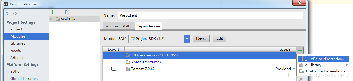 2.3 点击 Modules --> 选中项目“WebClient” --> 切换到 Dependencies 选项卡 --> 点击右边的“+”,选择 “JARs or directories...”,选择创建的lib目录