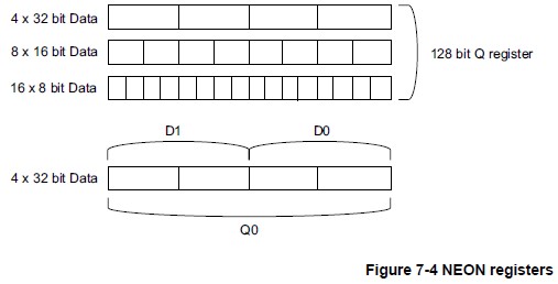 可以看到NEON寄存器可以作为4个32字节或者8个16字节或者16个8字节的寄存器来使用。