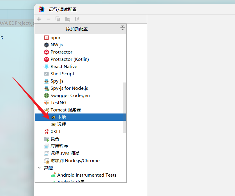 6 往下滑 找到Tomcat服务器(注意不是Tomcat EE)选择本地点击