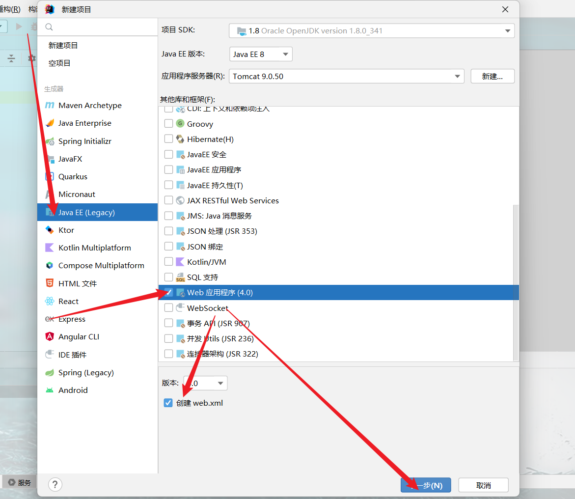 3 选择 Web应用程序 版本4.0 小勾勾也打上,最后点击确定