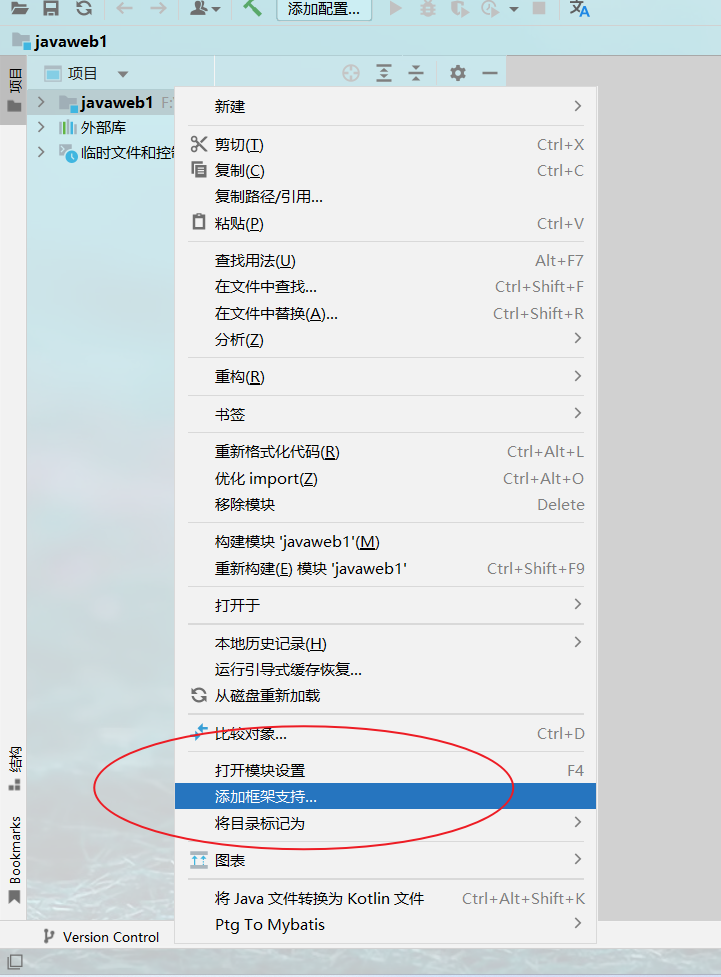 2 选中项目文件夹右击鼠标,选择添加框架支持