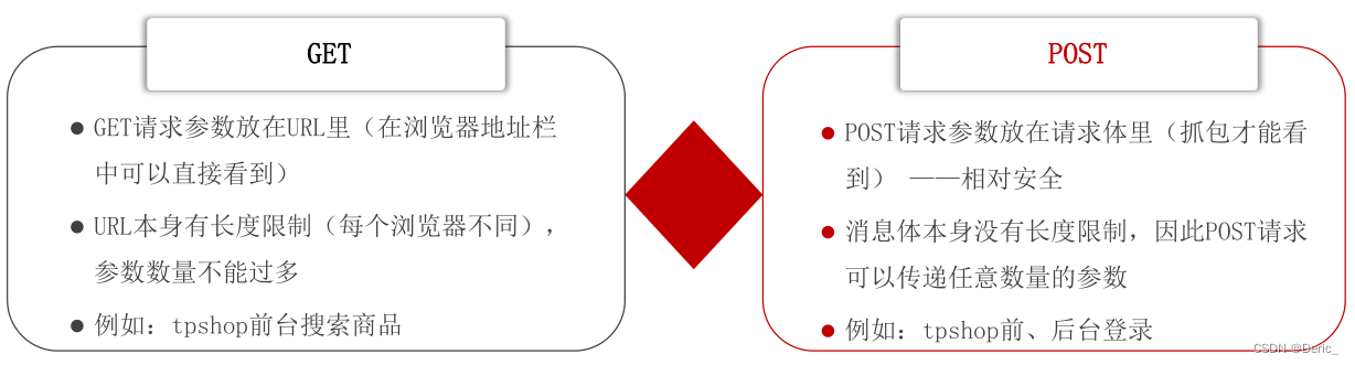 请求方法:在HTTP请求中有两个最常见的请求方法就是 GET和POST,他们都能向服务器发送请求并且携带参数。下图为他们的不同点,也是非常重要的概念,如在面试当中经常会被面试官提到也会在实际的工作当作高频遇上。