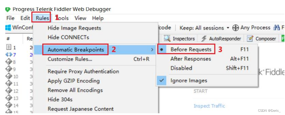 步骤1:找到Rules - Automatic Breakpoints - Before Requests(请求前)