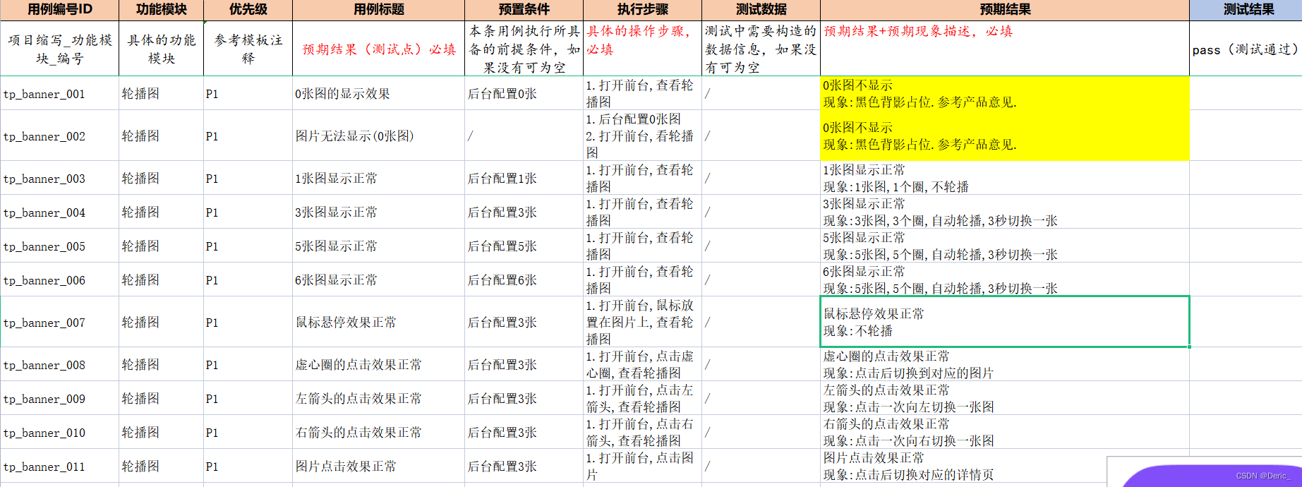 看到上面的需求点,我们可以先分析第一个需求,需求a是否存在模糊定义,存在不轮播时的图片是否显示背景是否变化的结果没有交代,再根据数字需求很明显我们可以使用用例设计方法中的边界值法来完成至少5条用例的设计;现在来看需求b鼠标悬停后效果这样也至少对应一条单独的测试用例;到需求c的话给出了鼠标交互设计的样式也能进行一条用例的设计;需求d则明显作为图片切换用例的交互功能测试也能利用等价类的方法设计至少两条用例,那么设计的测试用例成果就如下图所示: