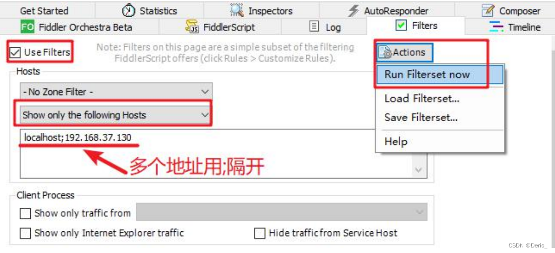 当然了,我们为了不想这么麻烦的抓取到一大堆无关紧要的东西,我们必然会选择过滤掉不必要的数据包,那么fiddler也提供了这样的过滤机制。在Filters的菜单 -- 勾选 Use Filters ,在第二个下拉框当中选择Show onlythe following Hosts,并输入目标hosts,最后在Actions -- Run Filterset Now立即执行。
