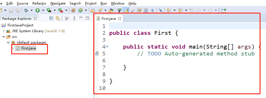 4.我们的第一个Java程序。上面步骤完成之后,Eclipse出现如下界面。左边src下多出一个刚刚新建文件First.java文件,右边代码域显示了默认创建的代码。(右边如未出现,则双击左边的First.java)