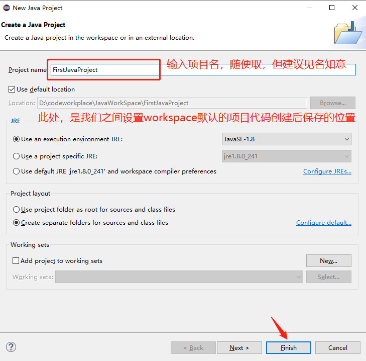 输入Java项目名,可根据自己项目的想法取一个有意义的名字,见名知意,然后点击Finish完成创建。