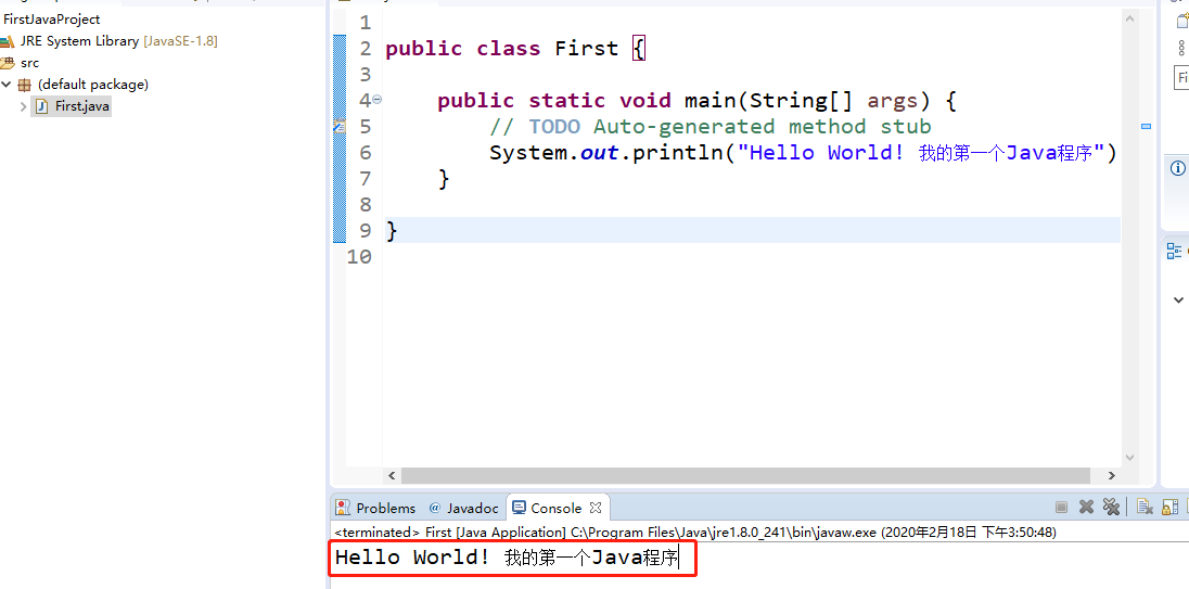 运行Java程序:在左边的First.java文件名上,右键-Run as - Java Application 运行刚刚编写的java程序。