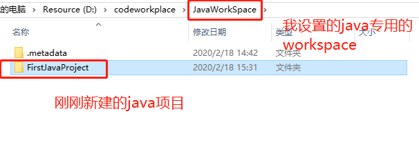 6.1 找到你设置的workspace目录设置的地方,然后就可以看到我们刚刚新建的java项目名,如我的:
