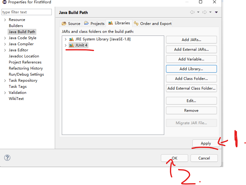4.就可以看到我们新加入的Junit 4 然后带点击 Apply------->然后ok