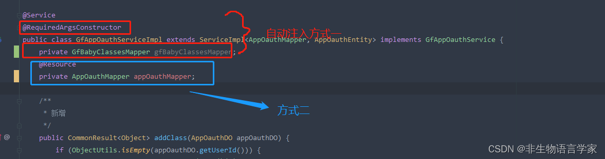 4、备注:实现类中的注入劲量用原生的,不要和一些非主流的混用,测试的时候容易冲突生成测试类的时候原生注解的mapper会生成不出来比如:方式二不能自动生成到单元测试中去