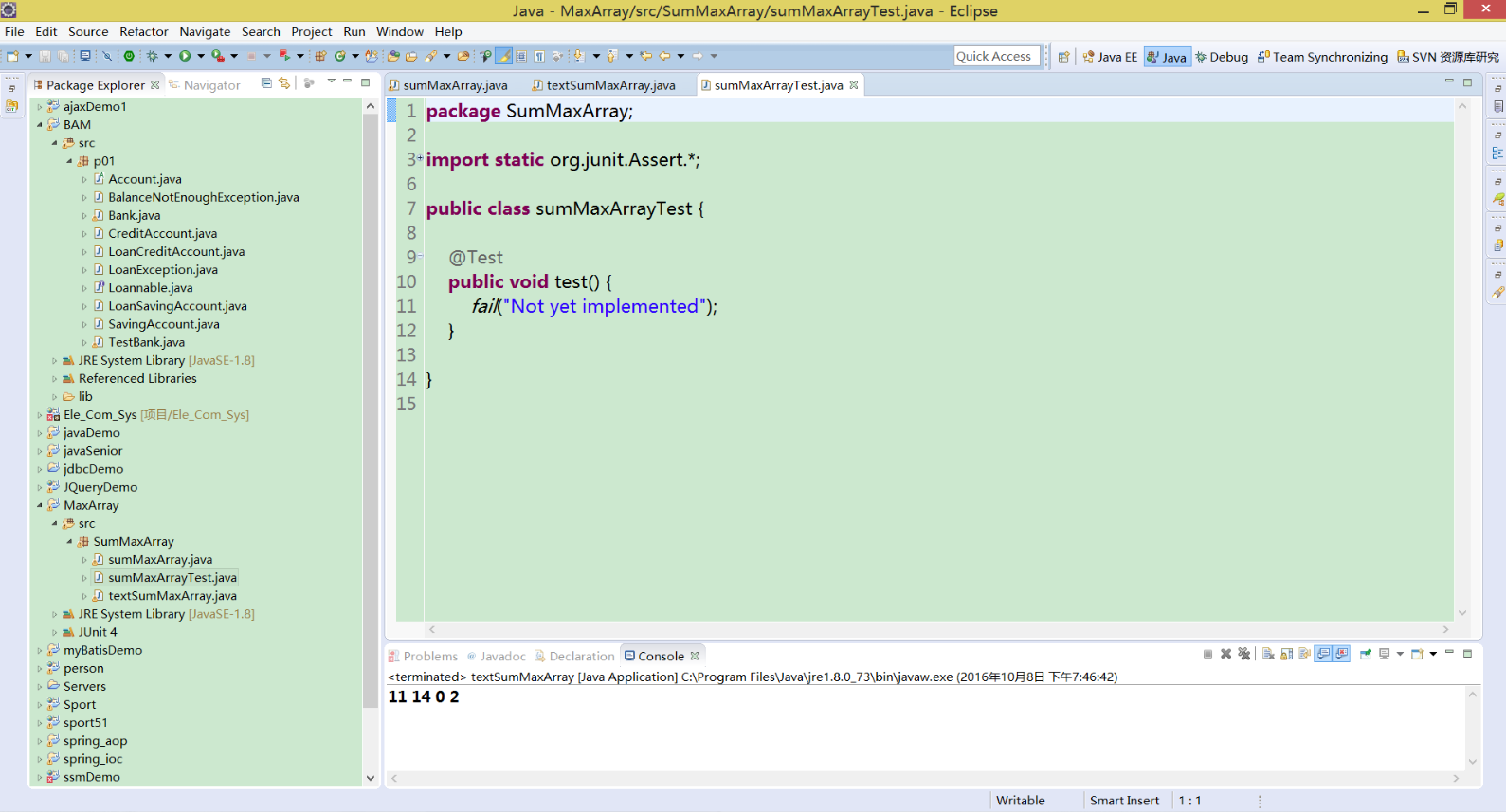 然后编写测试代码,具体代码已上传至coding中(https://coding.net/u/yuanjin/p/MaxArraySum/git/blob/master/sumMaxArrayTest.java)。我选择了7组数据进行测试分别包含了全正数、全负数、全零、正数和零、负数和零、正数和负数、正数负数和零,共七种情况,第一次测试结果如图十所示,显示有两组数据测试出错。