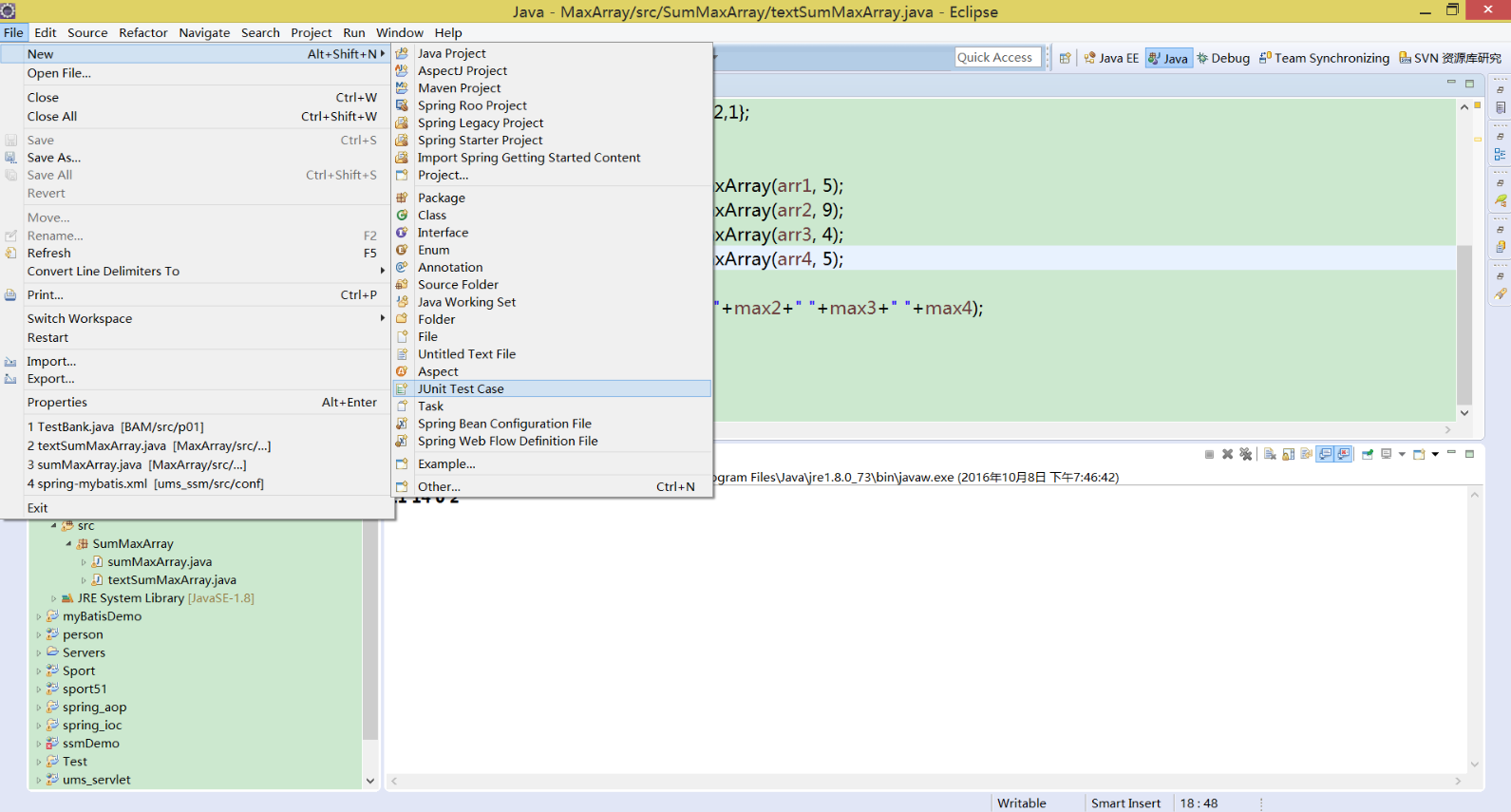 接下来对编写的最大子数组和进行测试,我使用的是Eclipse自带的单元测试工具JUnit,首先点击文件,新建,选择Junit Text Case,然后选择要测试的类和方法,如图八,创建成功如图九。