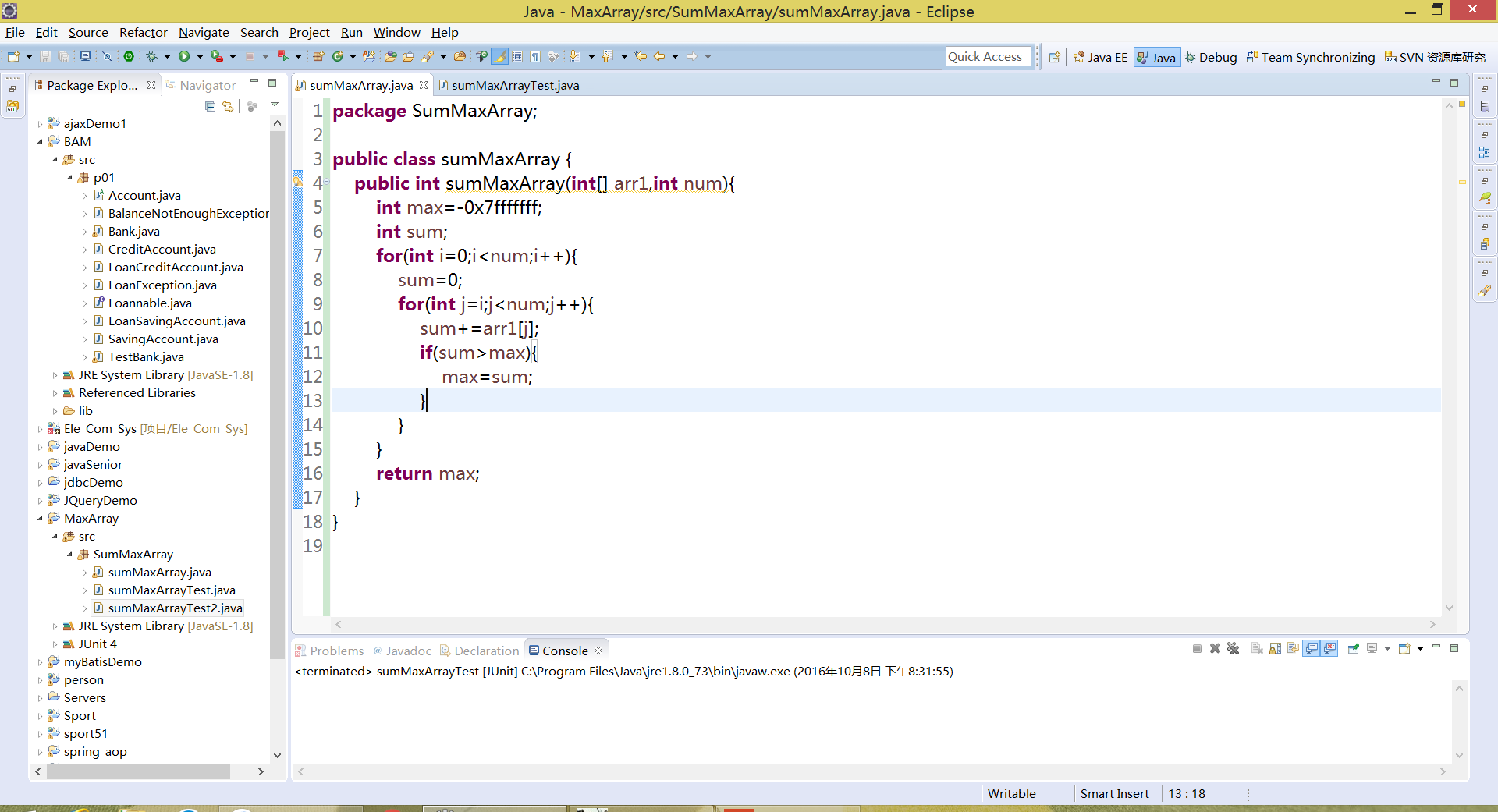 我实现程序的算法使用的是暴力枚举法,如图七所示,写了一个类,类中一个方法解决最大子数组和的程序。具体代码已经上传至coding中(https://coding.net/u/yuanjin/p/MaxArraySum/git/blob/master/sumMaxArray.java)。