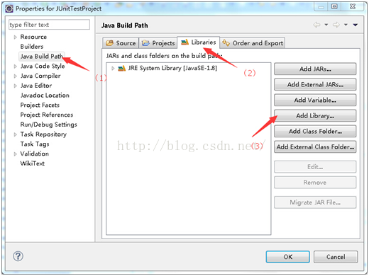 第二步:将JUnit单元测试包引入这个项目:选中项目名JUnitTestProject,右键弹出菜单中选择最后一项Properties(属性),在弹出的对话框中依次选择:Java Build Path /Libraries/Add Library…