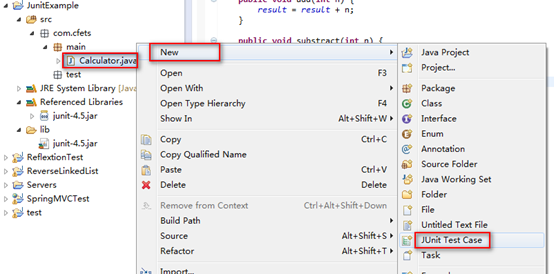 第三步,生成JUnit测试框架:在Eclipse的Package Explorer中用右键点击该类弹出菜单,选择“New à JUnit Test Case”。如下图所示: