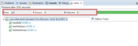 Errors的个数为0个,Failures的个数为0个,且显示均为绿色,表明在该单元测试下成功,运行结果如下: