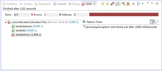 执行有错的情况,打红叉的表示测试失败,该单元测试中因为在求和函数中写了一个for死循环,并且在单元测试函数中设置了响应阈值为1000毫秒(1s),所以当执行超过1s则测试失败,表明需要对代码进行修改,其运行结果如下: