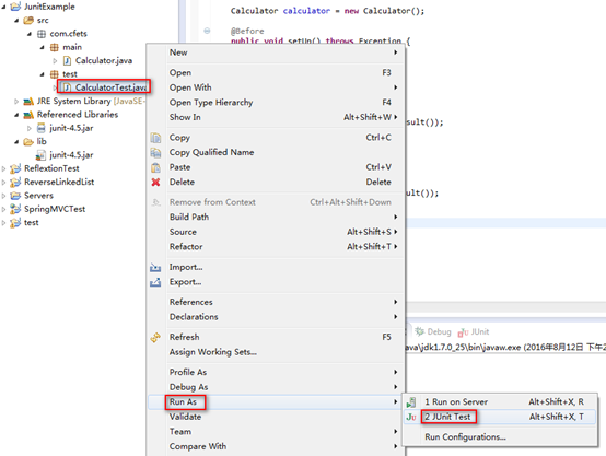 第四步,运行测试代码:按照上述代码修改完毕后,我们在CalculatorTest类上点右键,选择“Run As à JUnit Test”来运行我们的测试,如下图所示: