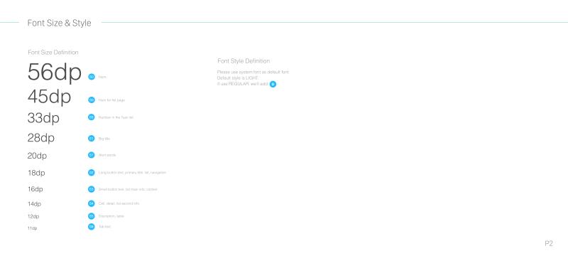 这是我们与工程师的“约定”,俗称Guideline。我们在Guideline中制定了一系列代号,它是由字母加数字组成,用来代替各色值、字号、控件等,工程师依照我们的代号在库中设置好,这样在工作中就不用每一次敲入长长的色号、字大小、控件等,只要输入代号就好,如这里的C是Color,S是Size的缩写。