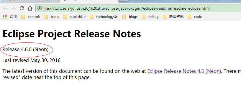 找到eclipse的安装目录,找到readme文件,打开其中的html文件,我的是4.6版本的,代号是oxygen