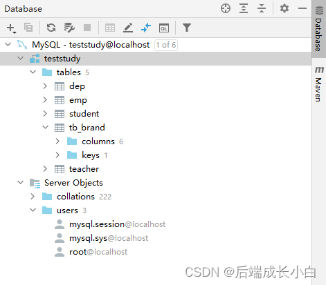 为了方便sql语句书写时有提示,需让idea连接数据库,使用database面板连接,第一次连接会提示无驱动包,需下载完成后再进行测试连接,连接成功后效果如下所示:
