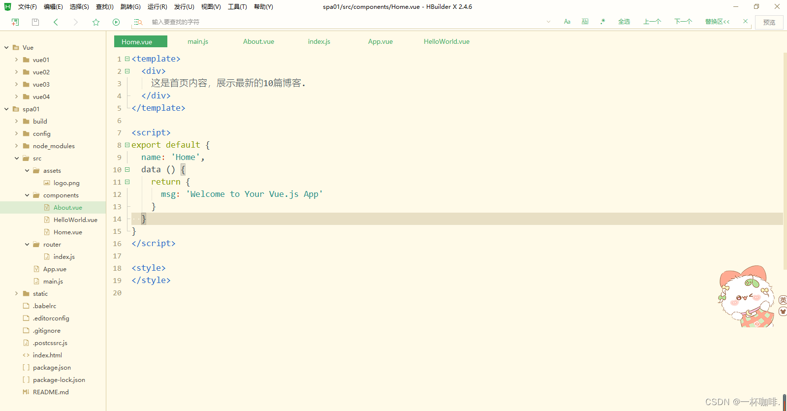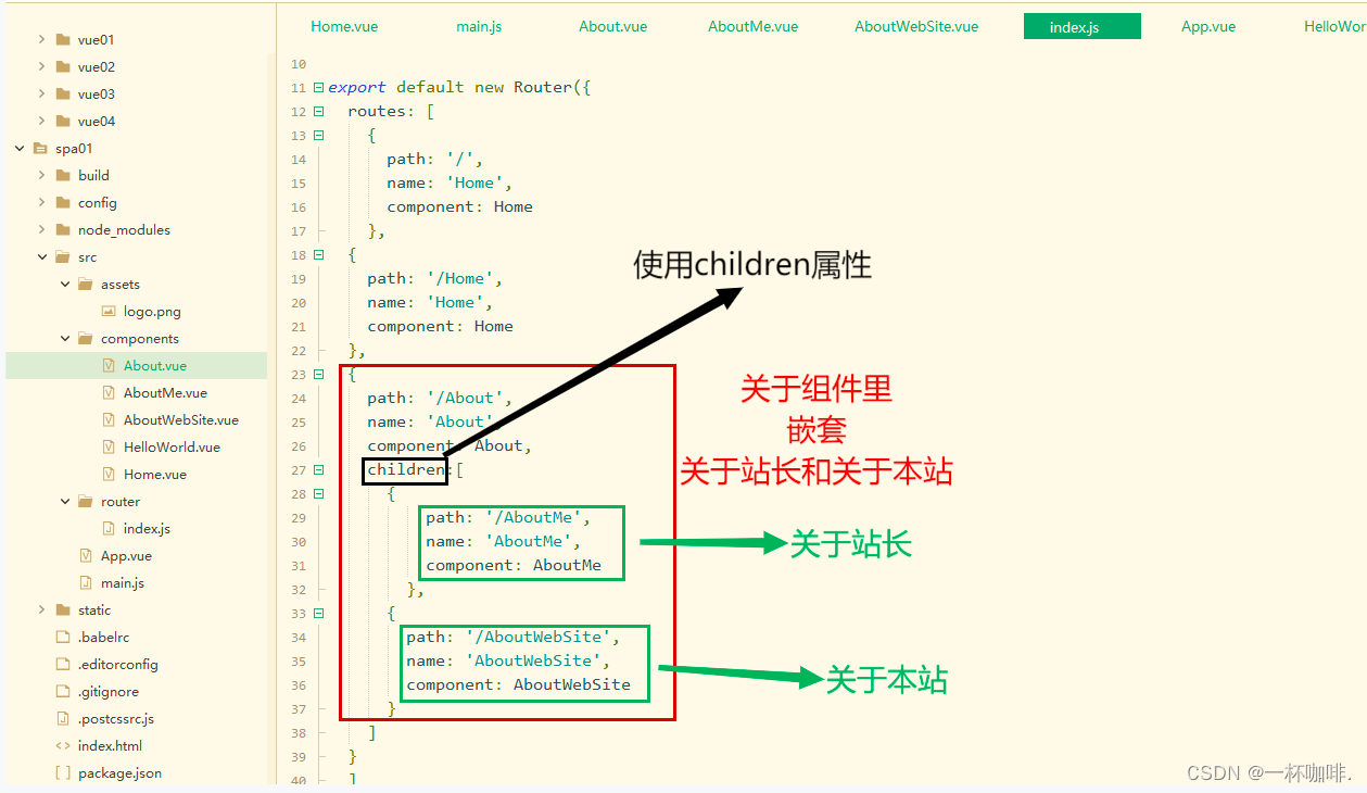 以上就是粗暴唇彩最近收集整理的关于如何使用vue-cli来搭建vue项目?详细步骤跟着我来吧!一、什么是vue-cli?二、前提:搭建好NodeJS环境三、使用脚手架vue-cli(2.X版)来构建项目 三、SPA完成路由的开发 四、嵌套路由五、知识总结 今日分享内容到此结束啦,希望本篇内容对您有所帮助!预告下期内容:【SPA项目开发之登录注册】我是一杯咖啡,我们下期再见!的全部内容,更多相关如何使用vue-cli来搭建vue项目?详细步骤跟着我来吧!一、什么是vue-cli?二、前提:搭建好NodeJS环境三、使用脚手架vue-cli(2.X版)来构建项目 三、SPA完成路由内容请搜索靠谱客的其他文章。