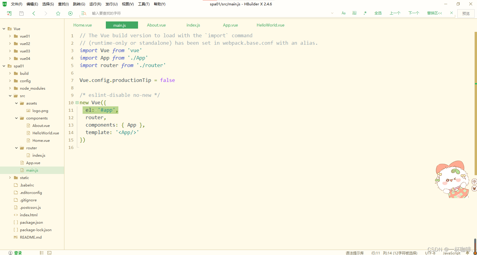 2、index.html通过man.js中的vue实例管理#app边界,同时制定App.vue模板
