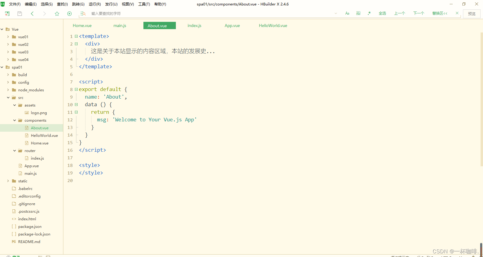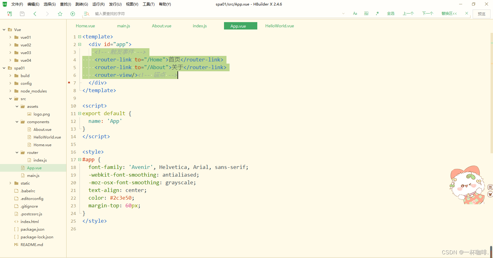 3、App.vue中包含了logo图片以及锚点,而锚点与组件的对应关系存在router/index.js中,所有就指向了一个组件