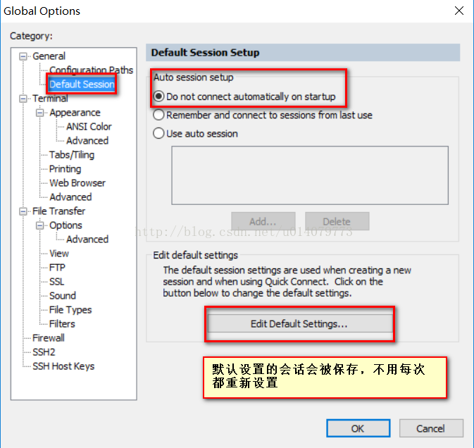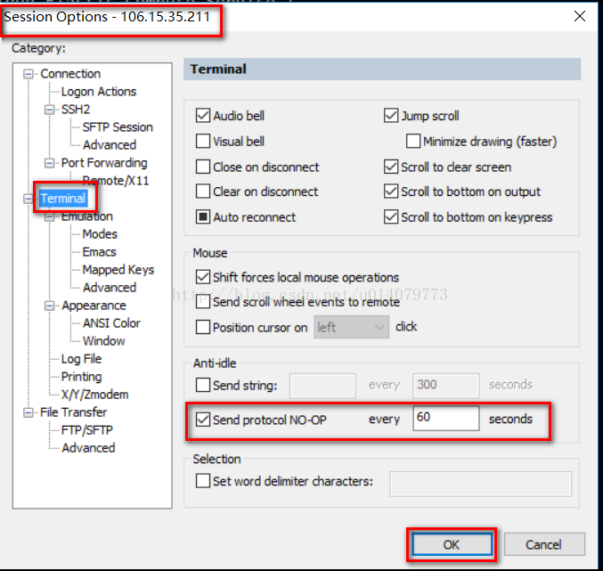 参照上面修改默认session配置,打开默认session配置窗口,选着terminal,勾选Send protocol NO-OP,一般选择60s就行了。