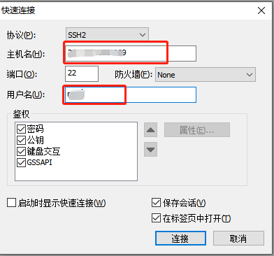 3、输入远程Linux系统服务器的IP地址和用户名